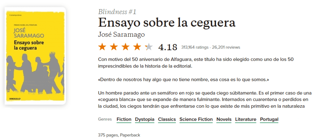 - Saramago, José, Ensayo sobre la ceguera, Punto de lectura, Ciudad de México, 2001 ↩︎