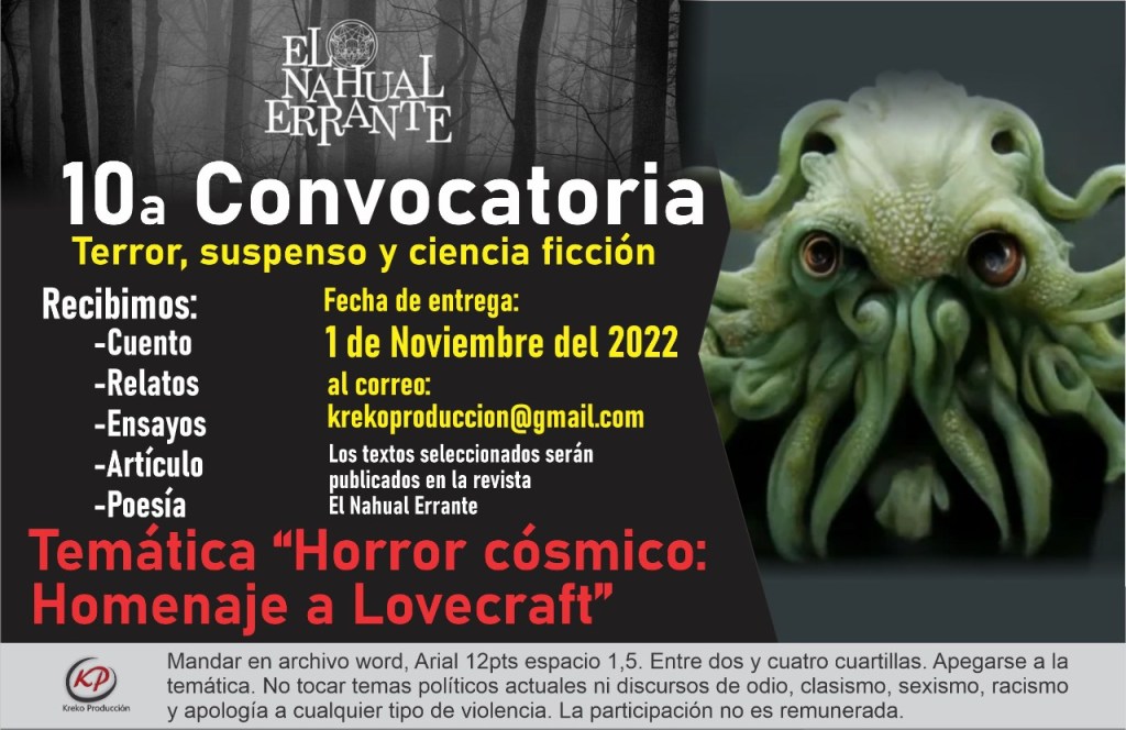 […] El Nahual Errante abre su décima convocatoria cuyo tema es el horror cósmico, pues se trata de un homenaje a H.P. Lovecraft. La convocatoria cierra el 1 de noviembre. Vean las bases completas. […]