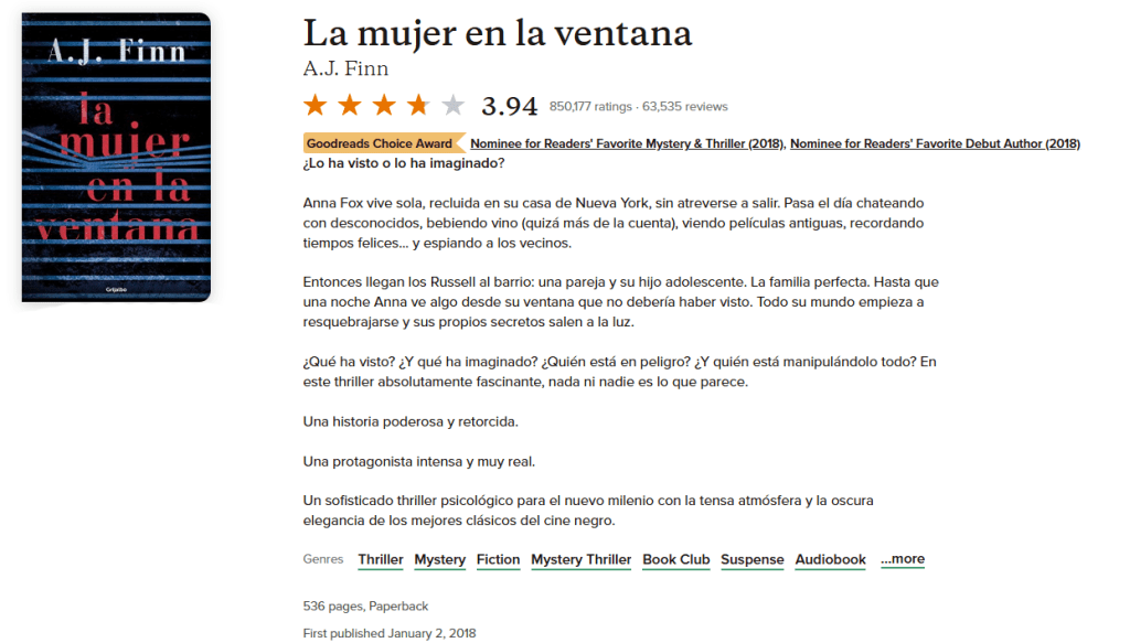 Ya sea la película o la novela, la sensación de ser estafado es la misma. Como protagonista tenemos a Anna Fox quien padece de agorafobia como consecuencia de un evento traumático y ahora vive recluida en su casa espiando de manera obsesiva a sus vecinos. Obviamente, no sabremos hasta por la mitad de la novela qué fue ese evento traumático que la tiene encerrada en casa. Esa premisa es el tema secundario que se va a ir aclarando capítulo tras capítulo, pero lo que nos tiene “pegados” a la lectura es lo acontecido con sus nuevos vecinos donde MUY probablemente sucedió un crimen.