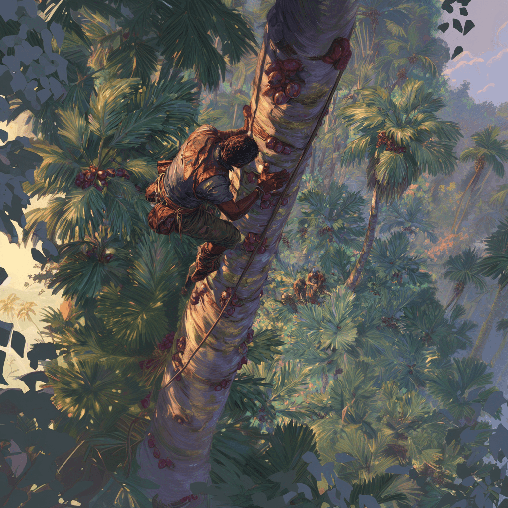 Entre las notas húmedas de la brisa, Beryl captó un polvo familiar: el polen de una palma dispersado por el viento del norte. Se adelantó al grupo con tal decisión que los otros no tuvieron más que seguirlo. Lo encontraron trepando el largo tronco de una palmera, acomodándose en la copa. Con la agilidad que sólo se obtiene con la práctica, cosechó montones de a lo que los muchachos les parecieron frutos, más bien semillas con un exterior carnoso. Una por una fue examinadas y, las que Beryl juzgó dignas, las guardó en el morral mientras que el resto las dejó caer entre las hojas. Aburridos y con antojo de carne, los grumetes se dedicaron a cazar los pájaros que aterrizaban deseosos de semillas. Las pequeñas aves se dejaban atrapar, adormiladas tal vez por la hora y el calor húmedo; también encontraron una decena de murciélagos de la fruta, dormidos todos bajo la copa de un árbol.